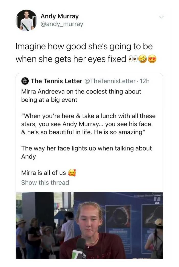 对于安德列娃对穆雷的这番二度告白,在社交媒体引发了热议。网球专栏作家汤姆在推特上调侃道:“穆雷现在不仅以网球传奇闻名,还成为了年轻选手的‘青春期偶像’。不过说真的,他确实像红酒一样越陈越香。”