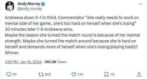 而事实上,穆雷作为网坛前辈,也一直对这位后辈颇为欣赏。2024年澳网,当安德列娃上演了一场惊人的逆转后,穆雷就在社交媒体上第一时间发文称赞了她在比赛中的心理素质。